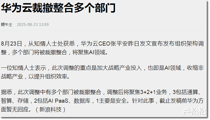 这一年多,华为云大大小小停了20多个业务了,像什么安全防护、DNS限速、内容审核差不多都停了,像这种小产品、边缘业务一条完整的业务线大概有几十人到一两百人规模。这些人条调整后大都是转岗了。