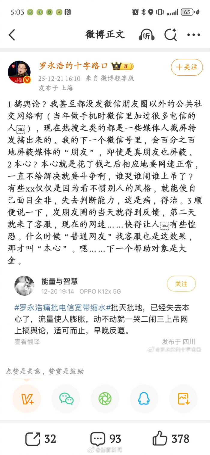 [#罗永浩吐槽后网速快到惶恐#]#罗永浩反问谁哭谁闹谁上吊#12月21日,罗永浩针对网传“靠舆论维权”一事作出回应。他表示,相关内容仅发布在微信朋友圈,并未发布至公共社交平台。